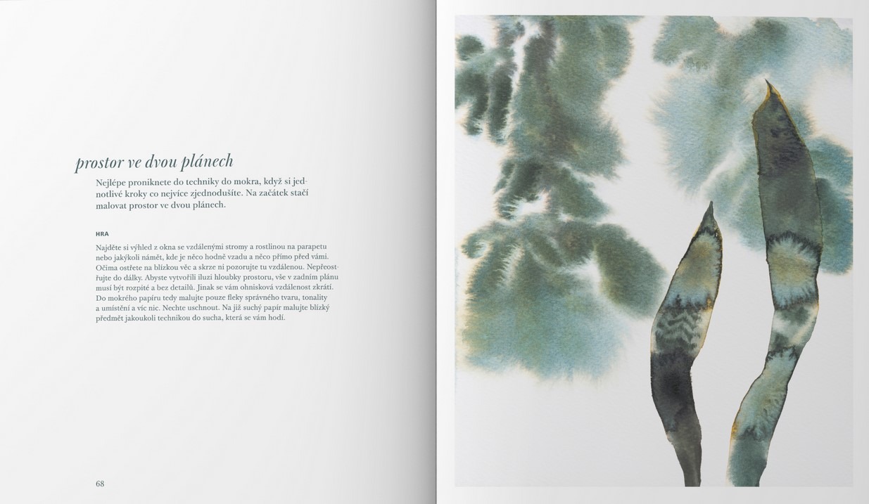 „Kdykoli otevřete knihu a začnete malovat, noříte se do přítomnosti. Díváte se, vnímáte, hrajete si s vodou. Akvarel, ve své nespoutané, divoké podobě je plný vody a nese její kvality. Takový akvarel se do značné míry maluje sám – a umí to nádherně. Velejemné přechody, krajkové struktury, vzdušné lazury, pohyb a život jsou v každém tahu. Malování akvarelem v knize rozděluji do mikro postupů, her. Můžete tak žasnout nad samotným procesem – nad působením vody, barev, štětců – a vaší rolí v procesu. Prohlubujete vnímavost ke kráse, k tomu, co je potřeba udělat, kde počkat a kde nedělat vůbec nic, protože se to už děje samo,” popisuje Klára Stodolová.