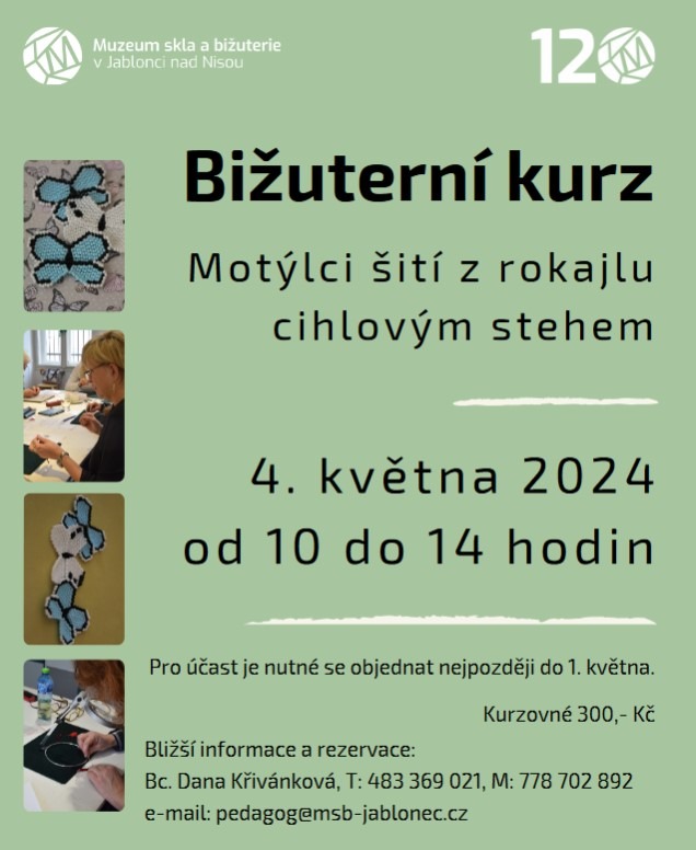 Pro předem objednané zájemce připravila lektorka Věra Černá workshop s výrobou motýlků šitých z rokajlu cihlovým stehem. Kurz je vhodný zejména pro mírně pokročilé dospělé. „Motýli z barevných perliček podtrhnou atmosféru jara a nápaditě ozdobí vaše oblečení,“ zve edukátorka Dana Křivánková.