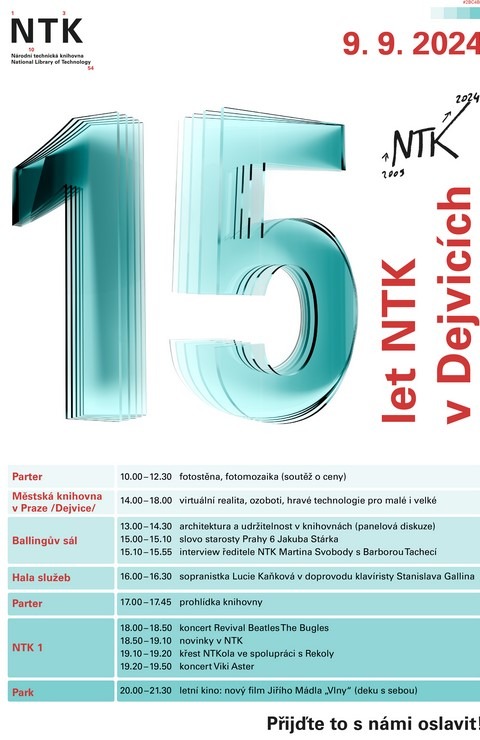 Národní technická knihovna (NTK) oslaví v pondělí 9. září 2024 patnácté výročí své existence v pražských Dejvicích. Za tuto dobu se stala nejen křižovatkou vědění, ale také místem, kde se setkává komunita lidí se zájmem pro poznání a inovace. Při příležitosti tohoto výročí zveme veřejnost na celodenní program plný zajímavých aktivit, diskuzí, koncertů a interaktivních zážitků. Oslavy vyvrcholí večerním promítáním filmu v letním kině a slavnostním představením novinek, které NTK do budoucna chystá.