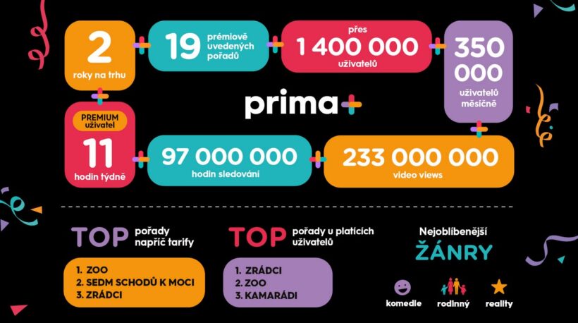 Jeden milion a čtyři sta tisíc uživatelů, tři sta padesát tisíc uživatelů měsíčně a dvě stě třicet tři miliónů zhlédnutí, tisíce epizod zahraničních seriálů, stovky epizod tuzemských sérií dříve než v televizi a desítky prémiových pořadů, to je bilance, jakou se může v tento den chlubit streamovací platforma prima+. „Zásluhu na ní má předně vlastní tvorba skupiny Prima. Nejvíce předplatitelů přivedly primě+ seriály ZOO a Kamarádi a detektivní show Zrádci,“ říká ředitel prima+ Petr Král. K nejoblíbenějším titulům napříč tarify* se v loňském roce zařadil také původní seriál Josefa Klímy Sedm schodů k moci. Odbornou veřejnost zaujal seriál Náhradníci, který herečce Ivě Janžurové vynesl nominaci na Českého lva. Z filmových titulů se divákům v loňském roce nejvíce líbil film Ostrov s Jiřím Langmajerem a Janou Plodkovou, Zápisník alkoholičky v hlavní roli s Terezou Ramba a fantasy pohádka Princezna zakletá v čase 2.