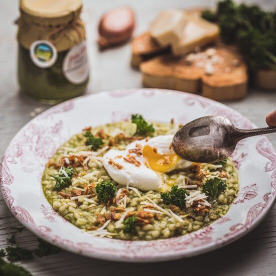 Zkoušeli jste někdy uvařit rizoto ze špaldových krup? Pokud ne, máte nyní jedinečnou možnost osvěžit si své kulinářské umění a zařadit surovinou, s níž nejspíše moc často nepracujete. V receptu najdete také další zajímavou ingredienci – pastu v přepuštěném másle z medvědího česneku od firmy dobroTY z Ráje, za nimiž stojí Martina Papežíková. Lákavě zelené dochucovadlo podobné pestu se může pochlubit ziskem značky Regionální potravina v Libereckém kraji. Můžete ho použít také do salátů, těstovin, polévek, na grilované maso… zkrátka kamkoliv.