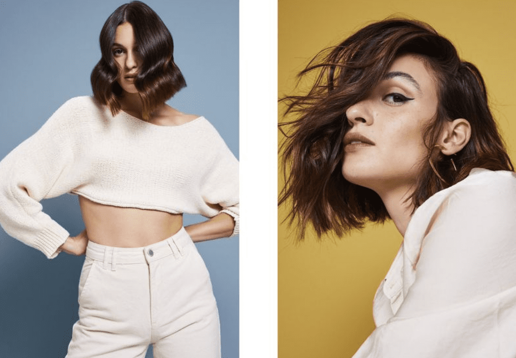 Bob je střih, který vyzařuje přirozenou eleganci, nadčasovost i trendy. V tomto podání vyniká objemem a lehce konkávní, ale kompaktní linií. V prvním případě vlasy krásně rámují modelčin obličej, druhý look je ležérní a v nenucených vlnách krásně vystupují barevné akcenty.