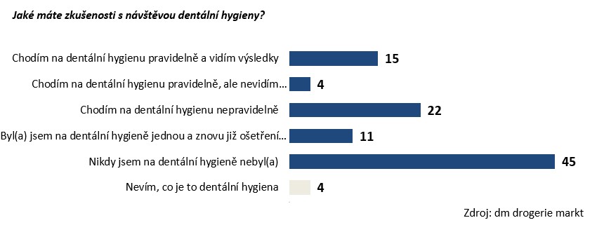 Z nejnovějšího průzkumu, který pro společnost dm drogerie markt připravila agentura STEM/MARK, mimo jiné vyplynulo, že 4 % dotázaných vůbec netuší, co znamená označení dentální hygiena. Bezmála polovina Čechů ji pak nikdy nenavštívila. Šetření také ukázalo, že svého dentálního hygienika lidé nejčastěji navštěvují nepravidelně, jedná se o 22 % dotázaných. „Toto procento se dále liší dle věku. Mezi nejmladšími věkovými kategoriemi od 18 do 29 let je to 32 %, přičemž tento podíl s věkem postupně klesá až na hodnotu 12 % ve věkové kategorii nad 60 let,“ přibližuje výsledky průzkumu Jiří Peroutka, manažer komunikace dm drogerie markt.