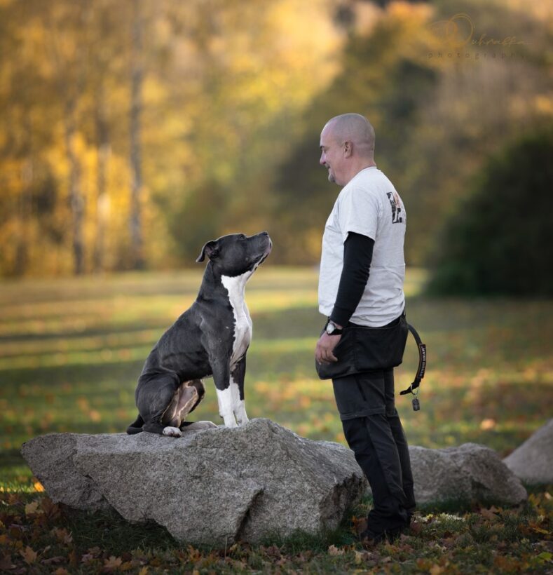 Původně to byl pes můj a mé přítelkyně, a při rozchodu jsme se dohodli, že zůstane mně. To mu byl asi rok. Já nikdy neměl psa, vždycky ho měly moje přítelkyně, nejdřív německý ovčák, potom zlatý retrívr, anglický buldok a nakonec Ari. Prvních 12 měsíců jsme chodili na všechny možné kurzy, pro štěňata, poslušnost, pokročilá poslušnost, obrany atd., ale nefungovalo to. Problém byl, že jsem Ariho nechtěl zlomit. Takže odpověď trenérů byla vždy stejná. Já nejsem dost důsledný, a co se divím, když mám staforda. Až ve škole, konkrétně v akademii ATA pana Ščučky, jsem se nakonec dozvěděl, že zásadní je něco úplně jiného. Právo toho psa, nebo jiného zvířete, snažit se, učit se s radostí a uspět. A být pak i odměněn.