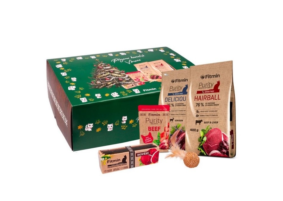 Hledáte perfektní dárek pro svou kočičí lásku? Máme pro vás tip. Fitmin připravil speciální vánoční balíček, který potěší každou mlsnou i hravou kočičku! V balíčku najdete 2 balení nejoblíbenějších granulí Purity Cat Delicious a Hairball (s lahodnou zvěřinou a hovězím masem), novou delikátní kapsičku Purity Beef (jen hovězí maso a srdce ve vývaru) a chutný hovězí pamlsek pro kočky Snax Stripes. A protože kočky milují nejen dobré jídlo, ale i hru, najdete v balíčku i oblíbenou hračku – kuličku s peřím, která zaručeně rozproudí každou kočičí duši! Vše je pro vás zabaleno v dárkové krabičce, takže stačí jen položit pod stromeček! Cena 339 Kč.