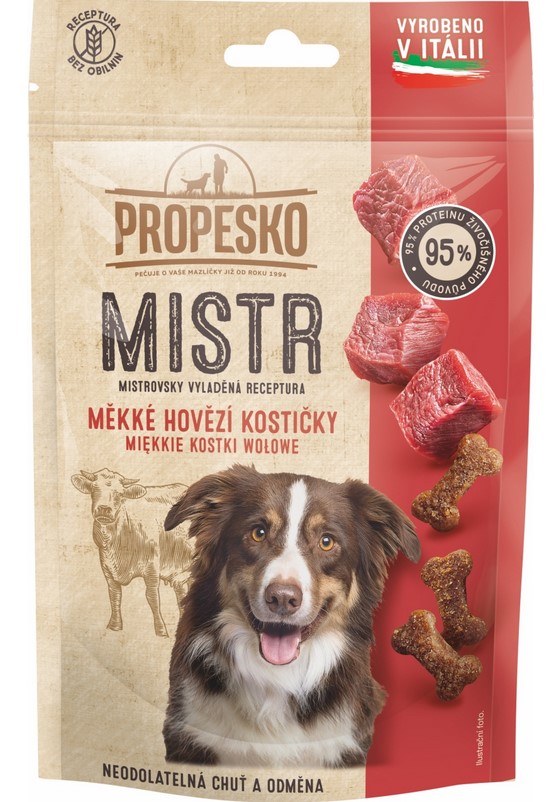 Snack má podobu malých kostiček, které jsou dokonale měkké a vynikají jedinečnou vůní masa, a především chutí hovězího, tak, že přilákají a nadchnou i toho největšího psího mlsouna. Jejich vyladěná prémiová receptura je založena na vysokém obsahu proteinů živočišného původů, kterých snack obsahuje 95 % a nechybí ani prospěšné vitamíny a minerály podporující zdraví a dobrou kondici psa. Propesko Mistr Měkké masové kostičky s hovězím jsou navíc vyrobeny zcela bez obsahu obilovin a neobsahují ani přidaný cukr, umělá aromata, barviva a dochucovadla, tak, aby psům poskytly nejen ten nejlepší možný způsob mlsání, ale aby se staly i kvalitní součástí jejich stravy. Vyráběny jsou v Itálii z pečlivě kontrolovaných surovin, s respektem a láskou ke psům a jejich potřebám i spokojenému soužití s páníčkem.
