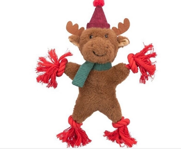 Vánoční plyšový sob je odolná a robustní hračka s provazem, šustící fólií a zvukem. Místo končetin má hračka uzlíky a pro ještě lepší potěšení ze hry vydává zvuk. Ideální vánoční dárek pro chlupáče pod stromeček!