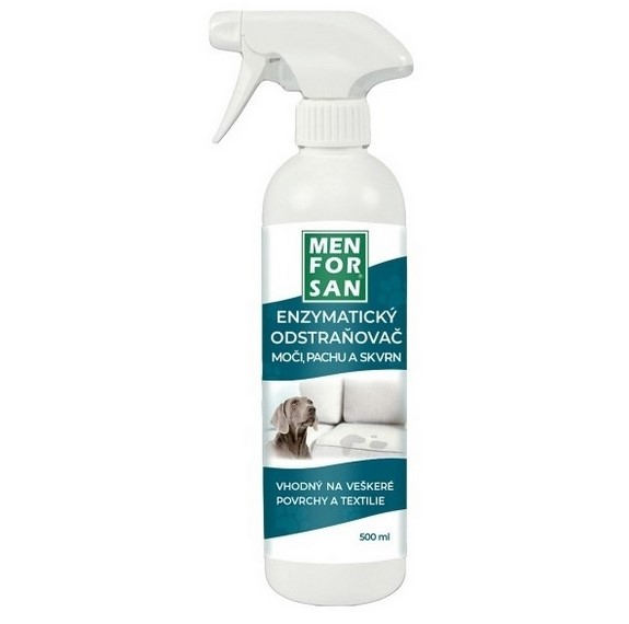 MenForSan enzymatický odstraňovač moči, pachů a skvrn je velmi účinný neutralizér zápachu zůstávajícího po psech a kočkách v rozprašovači. Ihned odstraní veškeré zapáchající skvrny od tekutin domácích mazlíčků. Více informací na spokojenypes.cz.