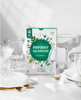 Nové EcoHaus papírky do myčky jsou plnohodnotnou náhradou klasických tablet, avšak bez plastového obalu, mikroplastů a zbytečné chemie. Každý papírek obsahuje přesně odměřenou dávku účinné mycí složky, která si hravě poradí s mastnotou, škroby, bílkovinami i zaschlými zbytky. Během mycího cyklu se zcela rozpustí, takže po sobě nezanechá žádné zbytky – jen zářivě čisté, lesklé nádobí.
