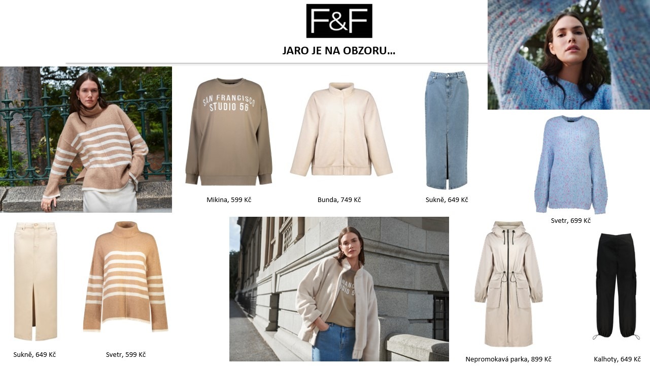 Britská módní značka F&F přináší inspiraci všem, kdo milují život, styl a šarm. První jarní ochutnávka nabízí elegantní modely, neformální kousky pro každodenní nošení, i nepostradatelnou řadu domácího a sportovního oblečení, a to včetně funkční kolekce F&F Active. Samostatnou kapitolu pak představuje DENIM, kde letos kromě oblíbených tvarovacích modelů dominují pouzdrové midi sukně, barevné džíny, nebo rafinovaný overal. Mezi klíčové prvky nadcházející sezóny jednoznačně patří kostýmky, oversized blazery, vestičky, nadčasový bomber, plisé sukně nebo kalhoty se širokými nohavicemi.