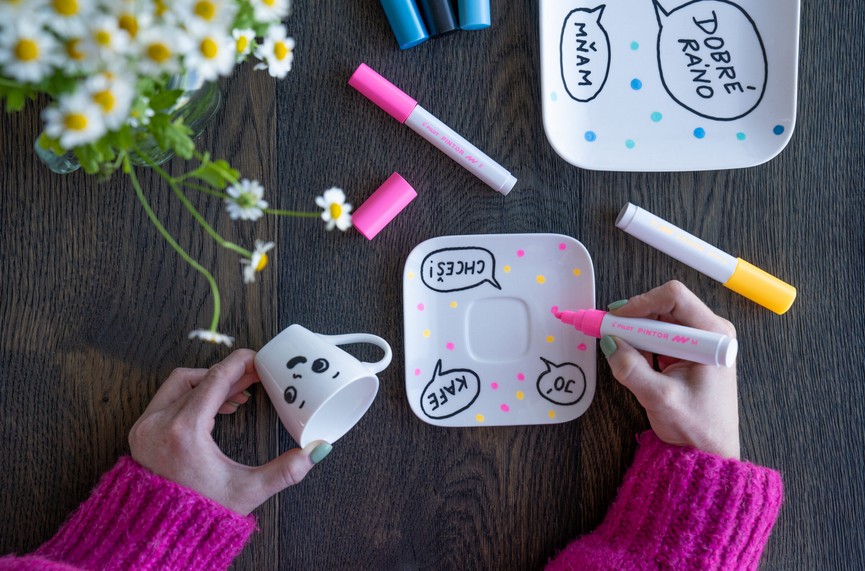 Dekorační popisovače Pilot Pintor otevírají nekonečné možnosti, jak vdechnout hrnečkům, talířkům či drobným dekoracím nový život a proměnit je v originální kousky, které rozzáří každý všední den. Obyčejný porcelán či sklo dostanou díky sytým barvám akrylových popisovačů Pintor úplně jiný, neobyčejný vzhled. Užijte si tvoření naplno, ať už sami, nebo s přáteli, a vybarvěte si svůj svět.