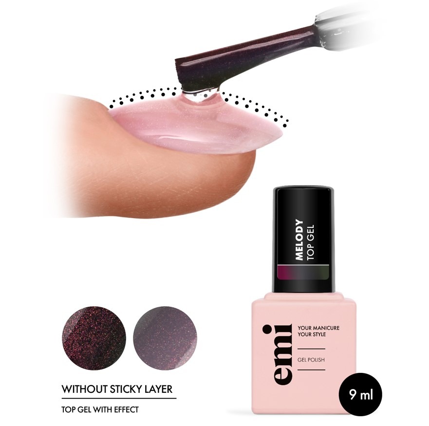 E.Mi představuje novinky, Melody Top gel lak na nehty. Lesklý top gel s perleťovým efektem „připomínajícím ploutev mořské víly“. Pigment ve složení září s hladkými gradientními vlnami různých barev, což dává manikúře efekt hloubky. Lesk vytváří tajemnou a poutavou kompozici na nehtech. Skvělý pro sváteční designy. Ideální pro klienty, kteří milují krásné efekty v manikúře bez použití dalších dekorací a preferují nátěry s lehkým saténovým nebo perleťovým leskem.