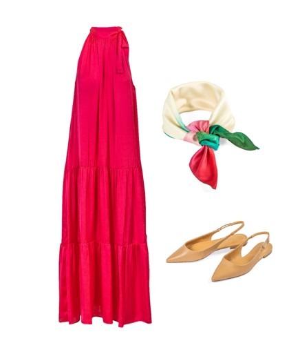 Dostali jste pozvánku na zahradní párty nebo piknik? Při výběru outfitu se nechte inspirovat výrazným a přesto elegantním stylem „barbie core“. Základem vašeho looku budou růžové maxi šaty s vysokým límcem ze směsi viskózy a lnu. K nim zvolte tzv. slingback baleríny – špičatou a minimalistickou obuv v nude odstínu, která patří mezi must-have kousky letošního léta. Náš tip: saténový šátek s jemným vzorem, uvázaný jako čelenka, dodá vašemu outfitu ten správný look!
