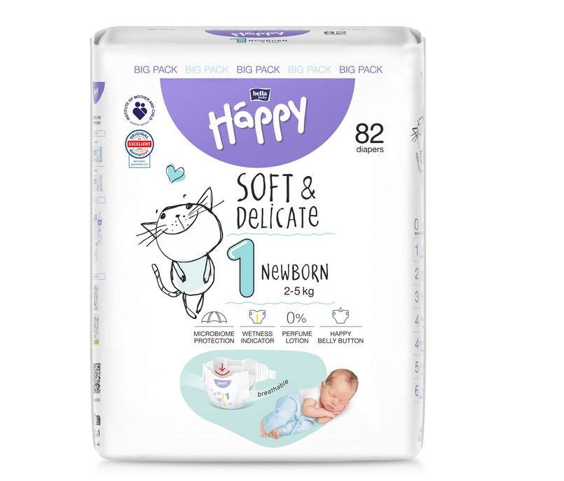 Dětské plenky Bella Baby Happy Soft & Delicate jsou k dispozici v sedmi variantách od velikosti 0 pro novorozence s nízkou porodní váhou do 2 kg až po velikost 6 pro děti s váhou nad 15 kg. Jsou vyrobeny z nejkvalitnějších materiálů s ohledem na pohodlí dětí i na ekologii, přičemž je při výrobě dbáno na co nejméně odpadu. Plenky se dokonale přizpůsobí tělu dítěte díky možné úpravě velikosti, aby odpovídaly reálné váze. Jsou vhodné i pro tu nejcitlivější pokožku, neobsahují alergeny, jsou bez parfemace a díky savému jádru se superabsorbentem poskytují pocit sucha a minimalizují vznik nepříjemných opruzenin. Pro pohodlí rodičů jsou všechny velikosti vybaveny indikátorem vlhkosti, který včas upozorní, že je čas na výměnu.