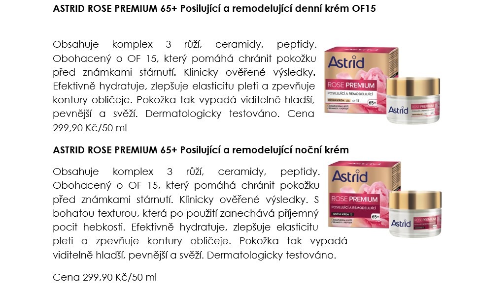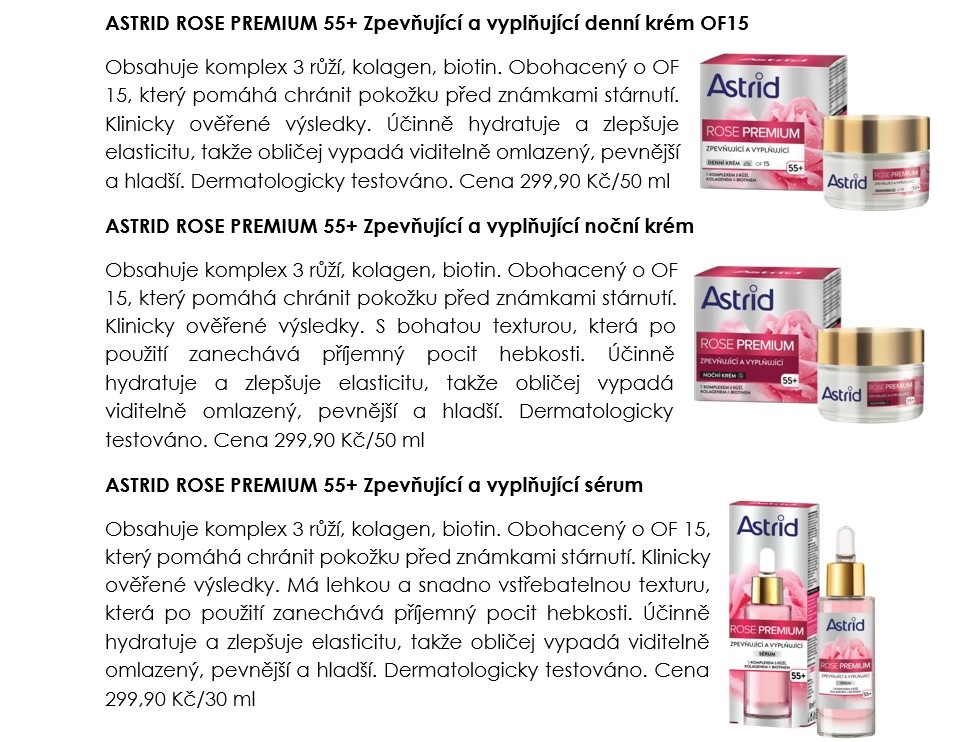 Nová prémiová řada péče o zralou a velmi zralou pleť Rose Premium od značky Astrid přináší produkty, které spojuje obsah inovativního komplexu tří růží s vynikajícími antioxidačními a zklidňujícími účinky. Ten pochází z výtažku růží Rosa Canina, Rosa Damascena a Rosa Centifolia které jsou známé pro své hydratační, protizánětlivé a anti-ageing účinky. Všechny produkty nové řady mají výborné klinicky ověřené výsledky, které potvrzují, že při pravidelném používání vypadá pleť pevnější, plnější a jemnější, barevný tón je zdravější a svěžejší a kontury obličeje a rtů vypadají viditelně redefinované.