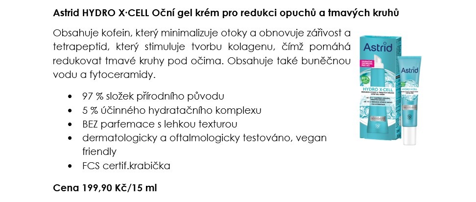 Řada Astrid HYDRO X∙CELL je určena pro péči o mladou pleť 20+ Řada obsahuje denní krém (i ve verzi bez parfemace), koncentrované sérum, oční gel, micelární vodu a gel a hydrogelové oční polštářky. Klíčový je vysoký podíl složek přírodního původu, a to minimálně 92 %, hydratační vlastnosti a účinné posílení kožní bariéry. Produkty obsahují mnoho aktivních složek, které pomáhají s tím, aby byla mladá pokožka dokonalá. V kategorii Cosmopolitan Beauty Awards byl oceněn oční gel krém Hydro Xcell.