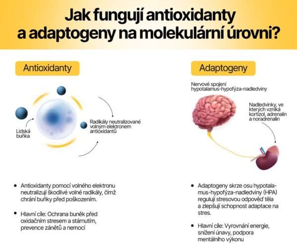 O významu základních vitamínů a minerálů pro lidský organismus dnes už ví snad každý. Jak je to však u méně známých aktivních látek, které příroda rovněž nabízí? Adaptogeny a antioxidanty hrají klíčovou roli v mnoha biologických procesech, přesto o jejich skutečném přínosu ví jen hrstka zasvěcených. Lidé si je často pletou a nejsou si jistí, jaký je mezi nimi rozdíl. Přitom jsou to právě tyto látky, které nás chrání před buněčným poškozením a pomáhají tělu zvládat stres – ať už psychický, fyzický, nebo emocionální! Ponořte se do světa výživy zase o něco hlouběji a zjistěte, jak antioxidanty ovlivňují oxidační stres, které potraviny jsou bohaté na adaptogeny a jaká rizika mohou nastat při nesprávném dávkování těchto aktivních látek.