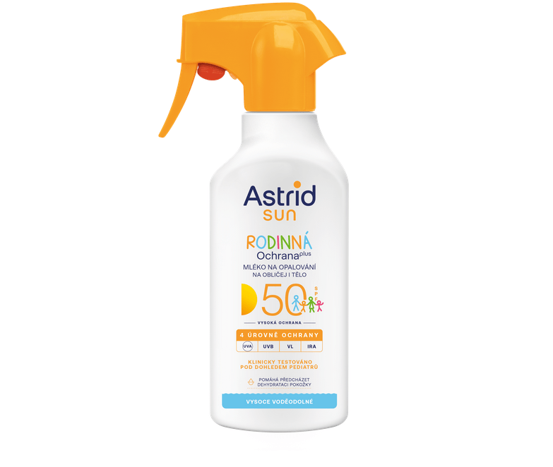 ASTRID SUN Rodinné mléko na opalování ve spreji SPF 50 zohledňuje speciální dermatologické potřeby dětí i dospělých a poskytuje optimální ochranu před 4 hlavními typy slunečního záření (UVA, UVB, VL*, IRA), které poškozují pokožku. Zároveň pomáhá minimalizovat riziko alergických reakcí. Cena: 399,90 Kč/270 ml