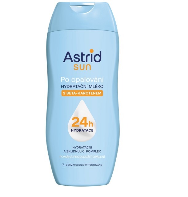 ASTRID SUN Hydratační mléko po opalování s beta-karotenem obohacené o hydratační a zklidňující komplex (D-panthenol, allantoin, bisabolol) efektivně hydratuje pokožku až po dobu 24 hodin a zanechává ji svěží. Díky beta-karotenu navíc přispívá k udržení a prodloužení opáleného vzhledu pokožky. Cena: 169,90 Kč/200 ml