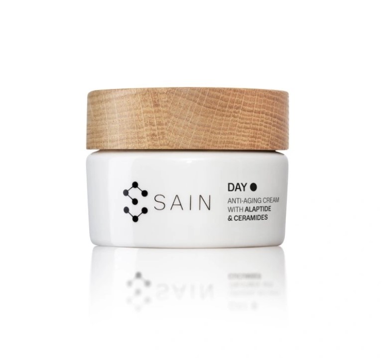 Jemný multifunkční denní krém s jedinečným složením účinných látek navržený pro všechny typy pleti napomáhá ke komplexní hydrataci a zpevnění pleti. Klíčovou složkou je pleťový booster, bioak- tivní peptid alaptid, který je speciálně vyvinutý k dlouhodobému omlazení a obnově přirozené struktury pokožky. Používáním denního krému SAIN® dochází ke znatelné redukci vrásek a viditelných známek stárnutí pleti. Kombinace alaptidu s dalšími účinnými látkami jako je kyselina hyaluronová, skvalan a ecoceramindy zajišťuje zrychlenou regeneraci pokožky a zvyšuje její elasticitu. Doporučujeme každé ráno nanést malé množství krému na vyčištěnou a tonizovanou pleť. Denní krém je k dostání v nádherném balení z českého porcelánu Thun® v kombinaci s dubovým víčkem, které je vyrobené ze dřeva českých lesů.