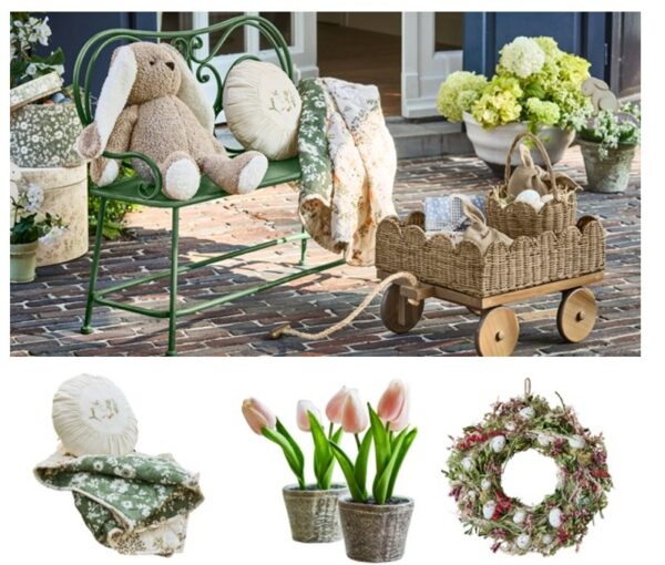 Oboustranný pléd s květinovým vzorem a polštářek se zajíčkem, LOBERON, 2 578 Kč, tulipány, 2dílná sada, LOBERON, 498 Kč, dekorativní závěsný věnec, LOBERON, 498 Kč.