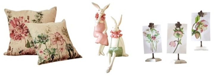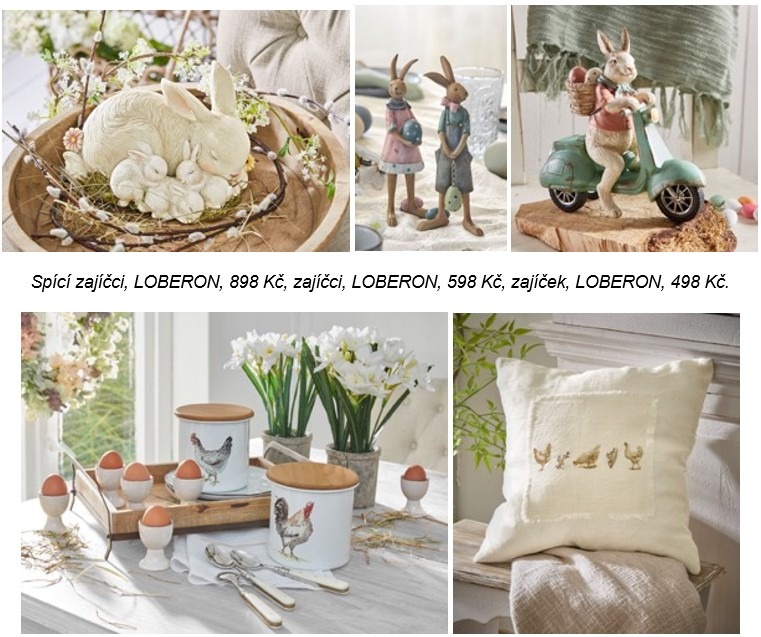 Povlaky na polštářky, 2dílná sada, LOBERON, 898 Kč, dekorativní zajíčci, 2dílná sada, LOBERON, 898 Kč, obrázky se stojánkem, 3dílná sada, LOBERON, 498 Kč.