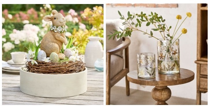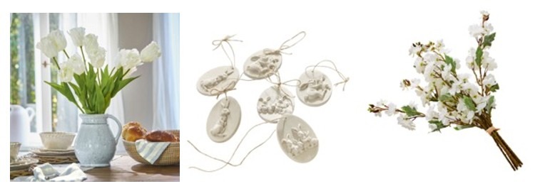 Dekorativní květy, LOBERON, 498 Kč, závěsné ozdoby s reliéfy zajíčků, LOBERON, 438 Kč, dekorativní květiny, LOBERON, 498 Kč.