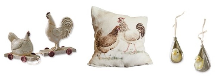 Slepice, 2dílná sada, LOBERON, 498 Kč, povlak na polštářek se slepičkou a kohoutem, LOBERON, 498 Kč, závěsné ozdoby – kuřátka, LOBERON, 248 Kč