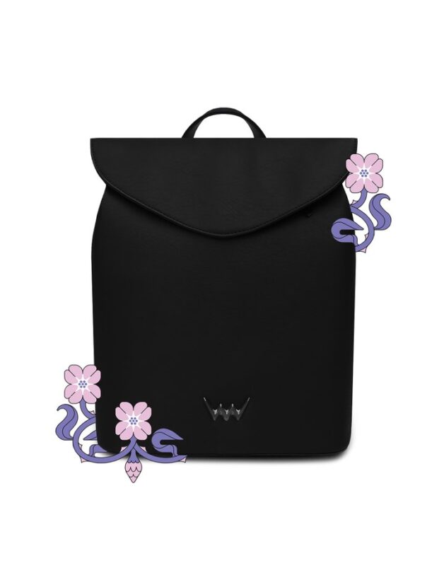 Dámský černý batoh Vuch Joanna in Bloom Rozanne s motivem divokých růží fialový