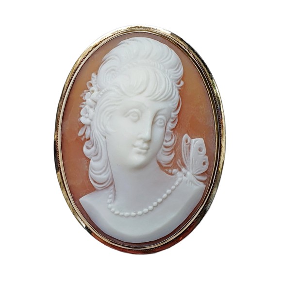 Brož z růžového 11karátového zlata z druhé poloviny 20. století je tvořena zručně vyhotovenou mušlovou kamejí s vysokým reliéfem. Zobrazuje ženu s náhrdelníkem a motýlkem, symbolizující postavu Psyché. Vdechněte díky ní noblesu a ženskost klasickému outfitu pro jakoukoliv příležitost.