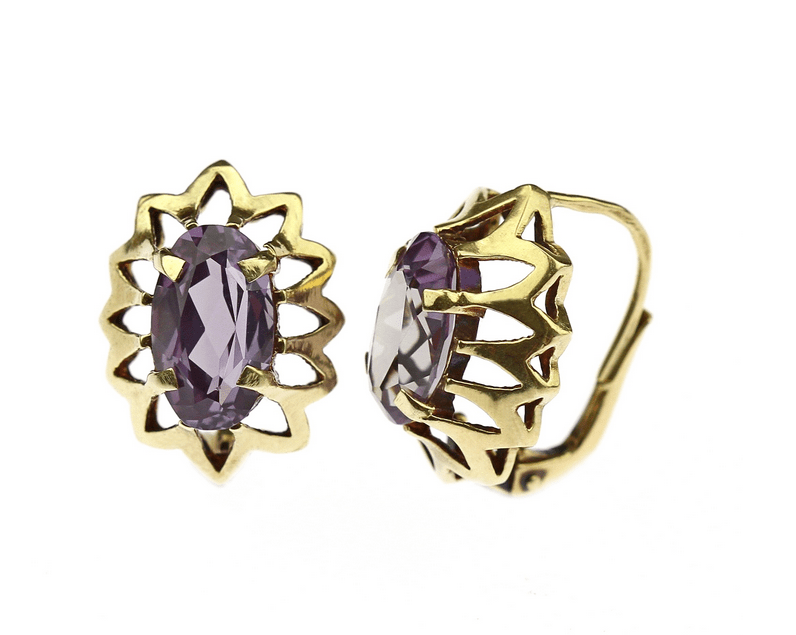 Tyto elegantní náušnice zaujmou nejen svou jedinečnou kombinací žlutého 14-ti karátového zlata a jasných syntetických safírů, ale také svou nezaměnitelnou krásou a kvalitou. Díky umělému vytvoření mají safíry stejné vlastnosti jako ty přírodní, avšak bez jakýchkoli nedokonalostí či prasklin. Náušnice pochází z 1.poloviny 20. století, jedná se tedy o kvalitní starožitný kousek se zapínáním na klasický dámský patent.