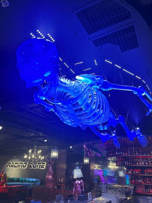 Pro instalaci vytvořili odborníci ze společnosti ARTGLASS speciální závěsný systém, který drží sochu v požadované poloze. Součástí systému je i nasvícení, díky němuž vynikne barva použitého skla a detaily sochy. Zatím bezejmenný kostlivec zdobí ode dneška prostory Hell Baru herny Levels v centru Máj – House of Fun.