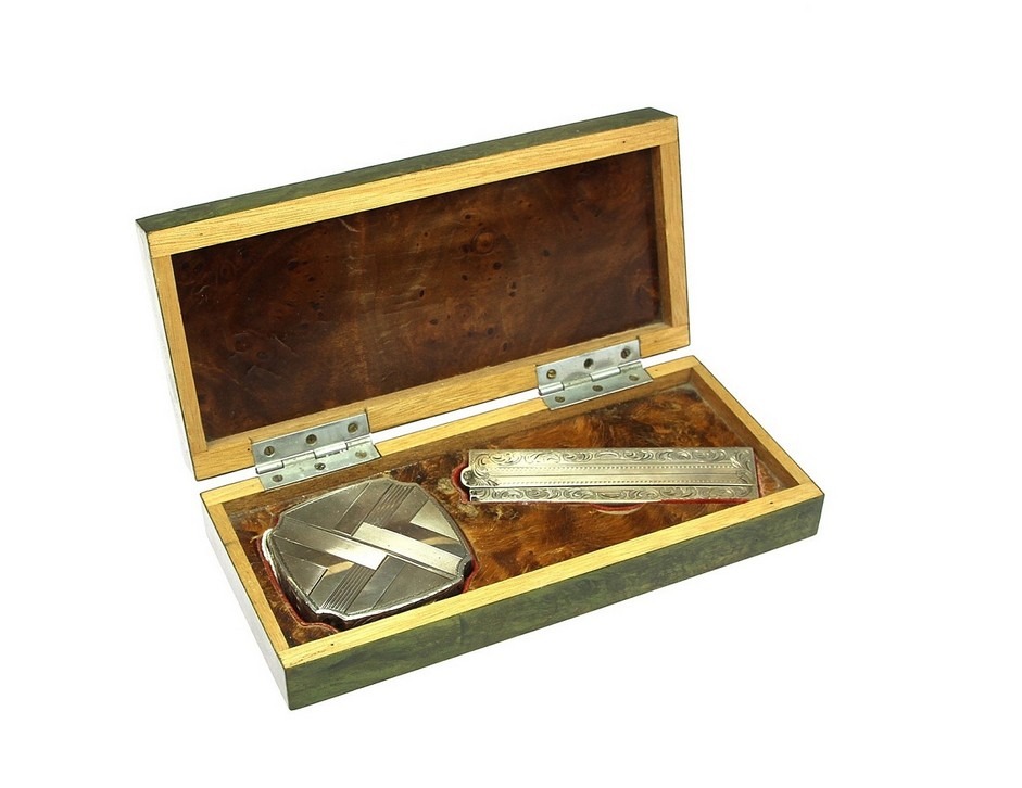 Pro milovníky vintage stylu je zde toaletní set ve dřevěné krabičce s intarzií. Obsahuje stříbrnou pudřenku se zrcátkem a ozdobný hřebínek, zdobené jemným gravírováním. Tento jedinečný historický kousek je ideální pro ty, kteří ocení eleganci minulých dob.
