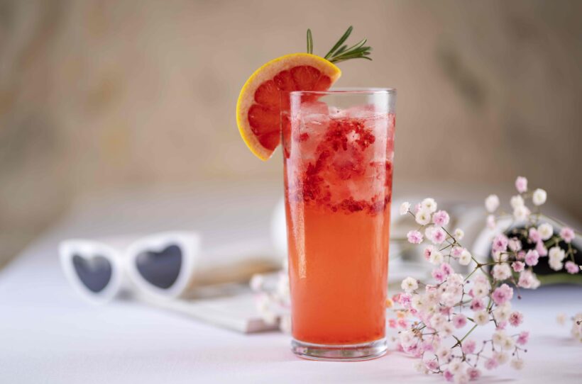 Ve sklenici rozmačkejte maliny a smíchejte s yuzu pyré. Zalijte doporučeným množstvím toniku a perlivé vody. Nakonec vše důkladně promíchejte, ozdobte růžovým grepem a rozmarýnem.