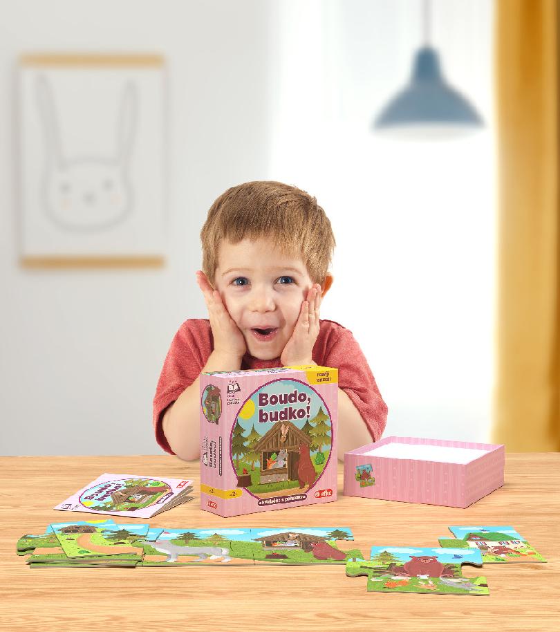 Boudo budko, O kohoutkovi a slepičce, O koblížkovi nebo O veliké řepě jsou čtyři samostatně prodejné skládačky s pohádkou. Rodiče předčítají pohádku a děti mají za úkol z dílků správně složit pohádkový příběh. V každém balení naleznete devět silných a velkých dílků a pohádku k předčítání. Složený obrázek je téměř metr dlouhý. Hra rozvíjí jemnou motoriku, slovní zásobu, logické uvažování a utužuje pouto mezi rodičem a dítětem. Všechny čtyři druhy zakoupíte za jednotnou cenu 259 Kč.