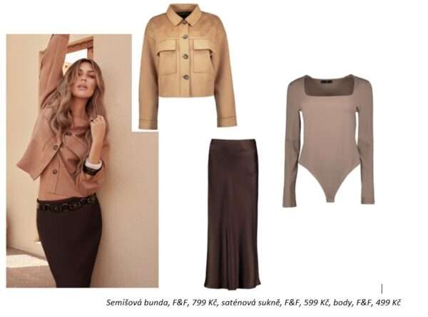 V souladu s trendem tón v tónu „od hlavy až k patě“ nabízí F&F bohatý výběr, ať už sáhnete po oblíbeném setu, nebo si outfit poskládáte z jednotlivých kousků. Jednoznačným must-have pro jarní i letní měsíce je semišová bunda. Dokonalý model v hnědé barvě, extrémně jemný umělý semiš a minimalistický design perfektně doladí look ve stylu boho chic. Nezklame ovšem ani v kombinaci s vysoce elegantní tmavě hnědou saténovou sukní, jakou zvolila Abbey Clancy.
