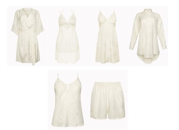 Zleva: župan Lisca Selection Miracle, 2349 Kč; košilka Lisca Selection Miracle, 2199 Kč, noční košile Lisca Selection Miracle, 1819 Kč; pyžamový top Lisca Selection Miracle, 899 Kč; pyžamové šortky Lisca Selection Miracle, 1199 Kč.