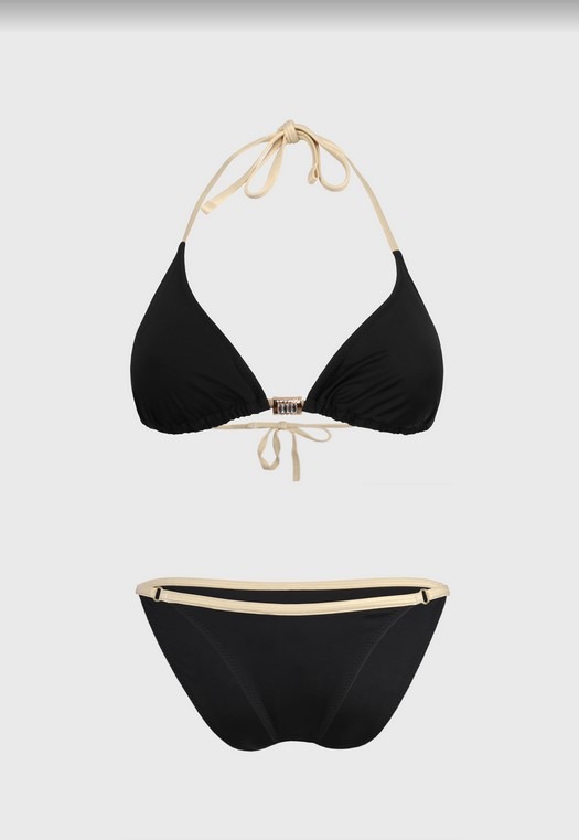 Bikiny Bibi ocení především milovnice decentního minimalismu. Trojúhelníčkové košíčky s vyjímatelnými vycpávkami, které se zavazují zlatou šňůrkou za krkem a na zádech, sedí spíše menším prsům. Podprsenka je uprostřed ozdobena vkusnou zlatou sponou, která dodává plakám punc luxusu. Kalhotky jsou klasického střihu a ozdobná šnůrka zlaté barvy se dá po stranách nastavovat dle potřeby. Plavky jsou ušity z velmi příjemné a rychleschnoucí plavkoviny (80% polyamid, 20% elastan).