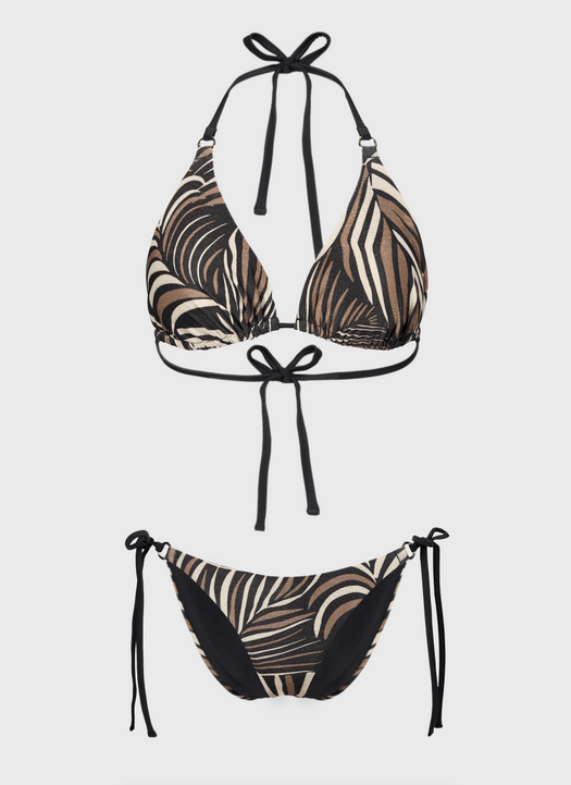 Milovnice bikin ocení skvělý střih i krásný design bikin z kolekce Shiny Brown. Tento komplet podtrhne vaše ženské křivky i letní opálení. Trojúhelníčkové košíčky jsou bez kosDc a nejsou vyztužené. Dokonale střižené, vykrojené kalhotky zvýrazní vaše dlouhé nohy. Plavky se dají regulovat pomocí šňůrek.