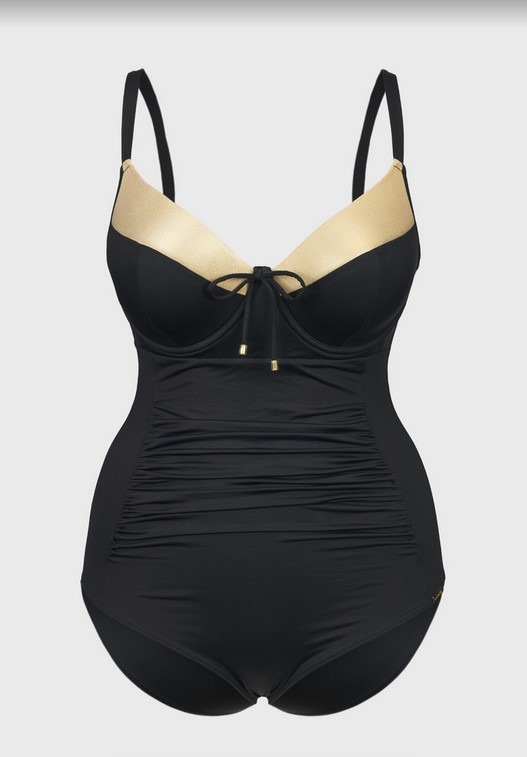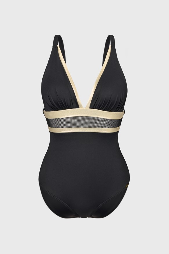 Jednodílné zešthlující plavky Yasmin navržené specialisty z Astratexu jsou určené především pro plnější tvary. Hluboce střižený, zlatem lemovaný dekolt sedí především bujnějšímu poprsí. Oporu mu poskytne podprsenka s lehce vyztuženými košíčky a kostcemi. Ramínka jsou délkově nastavitelná, zapínání vzadu je na kovovou sponu. Přední část plavek je podšitá formujícím materiálem, který vyhladí a sjednost kontury těla. Decentní nařasení postavě optcky lichotí.