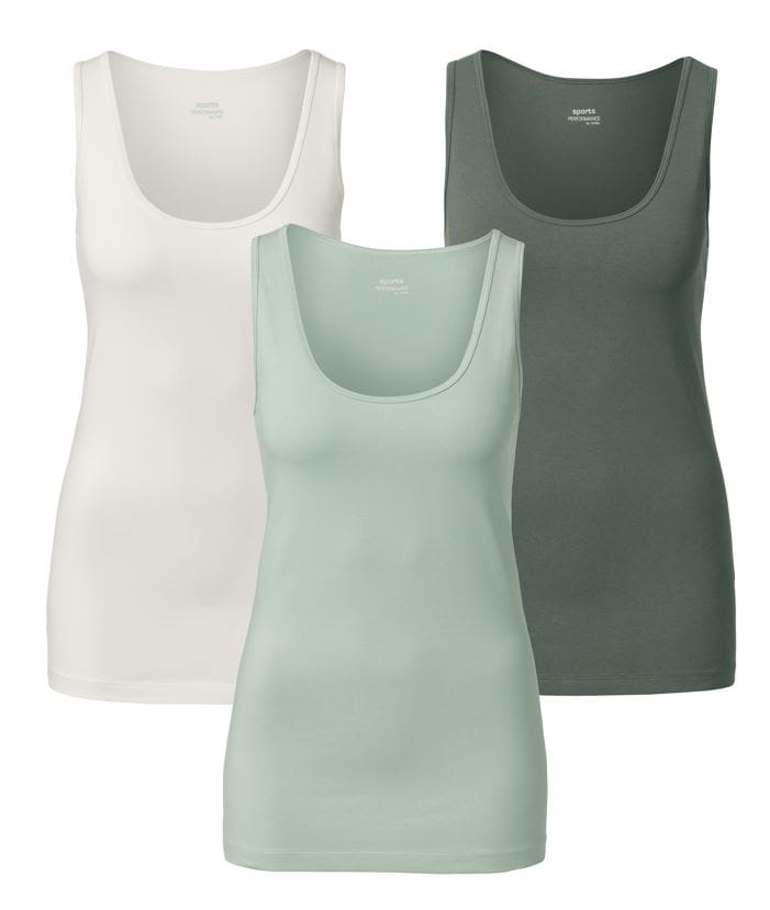 Topy jsou s bavlnou Cotton made in Africa. Mají mírně projmutý střih. V nabídce jsou dvě různě barevné sady – v jedné sadě jsou topy v béžové, světle zelené a tmavě zelené barvě a ve druhé sadě jsou ve světle modré, modré a šedé barvě. Předběžná cena za sadu 499 Kč.