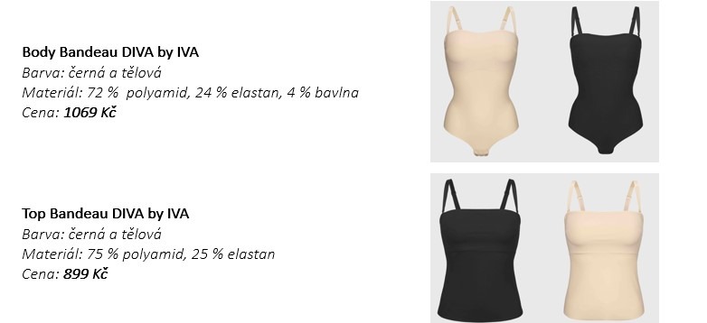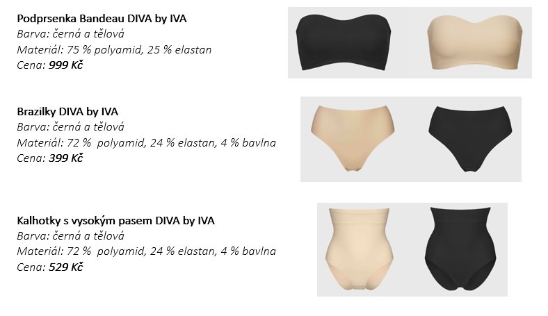 Nebojte se odhalit křivky jako Iva Kubelková, která pod rafinované síťované šaty zvolila tělovou podprsenku DIVA by IVA a kalhotky s vysokým pasem ze stejné kolekce. Podprsenka v bandeau střihu je vybavena unikátními kosticemi vyrobenými na zakázku, které udrží i velká prsa. Díky silikonovým páskům umístěným okolo celého obvodu nahoře i dole skvěle drží i bez ramínek. Variabilně odepínací a nastavitelná ramínka jsou praktická pod jakýkoli, i asymetrický outfit. Kalhotky s vysokým pasem příjemně obepnou bříško a vyhladí křivky. Kalhotky jsou vyrobené z velmi kvalitního materiálu a okraje jsou řezané laserem, takže jsou vhodné i pod upnuté oblečení.