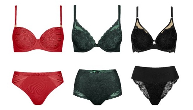 Zleva: červený set Lisca Princess, podprsenka 1379 Kč, kalhotky 579 Kč; tmavě zelený set Lisca Evelyn, podprsenka 1299, kalhotky 819 Kč; černý set Lisca Charisma, podprsenka 1679 Kč, kalhotky 899 Kč.