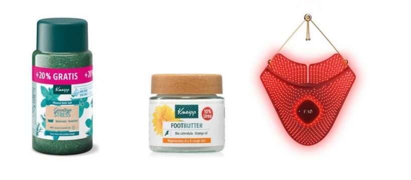 Sůl do koupele Goodbye stress, 600 g, 199 Kč, Kneipp, Máslo pro péči o chodidla, 100 ml, 189 Kč, Kneipp, Maska proti stárnutí krku a dekoltu FAQ 211, 10 690 Kč, FOREO