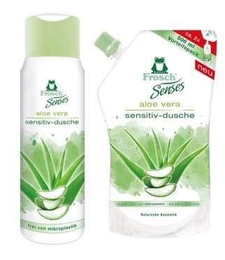 Řada sprchových gelů Frosch Senses 300 ml má šetrnou recepturu na bázi přírodních látek s neutrálním pH 5,5. Složení je obohaceno o panthenol pro hydrataci pokožky. Dermatologické testy potvrzují výbornou snášenlivost sprchových gelů i u citlivé pokožky. Krásně svěže voní, a navíc nezatěžují přírodu. Frosch EKO Senses Aloe vera nabízí kromě klasického balení i variantu náhradní náplně. Doporučená cena 300ml balení i náhradní náplně 500 ml je 85,90 Kč.