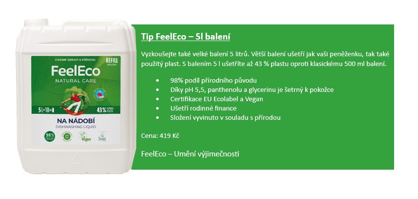 Pokud nepoužíváme myčku, je vhodné se zamyslet, jakým způsobem myjeme nádobí při ručním mytí. Asi vás nepřekvapí, že mytí pod tekoucí vodou je méně úsporné než mytí v napuštěném dřezu. Pokud vás čeká větší množství nádobí, rozhodně se vyplatí napustit si dřez. Teplota vody by měla být příjemně teplá na pokožku, což výrazně urychlí rozpouštění mastnoty a nečistot. Pokud máte termostatickou baterii, nejlépe je začít s teplotou přibližně 43 °C, kdy voda lehce vychladne a mytí je příjemnější. Následuje nadávkování mycího přípravku, který by měl být účinný, ale zároveň by neměl obsahovat čistě odmašťující složky, protože přichází do přímého kontaktu s vaší pokožkou na delší dobu a v teplé vodě. Řada produktů na trhu vybízí k používání rukavic, což ale není vůbec příjemné, proto je důležité hledat prostředky, které takovouto ochranu nutně nevyžadují. „V případě ručního mytí nádobí se vyplatí zvolit takový přípravek, jehož složení a vlastnosti budou důsledně zohledňovat vlastnosti a zdraví pokožky a zároveň budou šetrné k přírodě. Roztok přípravku je po celou dobu mytí nádobí v kontaktu s pokožkou a u těch, kteří ji mají citlivou, by nevhodné složení mohlo způsobit podráždění, vysušení nebo popraskání kůže. Sledujte informace o složení, certifikacích produktu a biologické rozložitelnosti přípravku.“ vysvětluje Radek Marták, ředitel výzkumu a vývoje FeelEco. Dále doplňuje, že přípravky na ruční mytí nádobí FeelEco byly vyvinuty tak, aby všechny tyto aspekty splňovaly bez kompromisů. Mají přirozené pH 5,5 a obsahují biologicky aktivní kosmetické složky výrazně zjemňující vliv mycí procedury na kůži, například glycerin a panthenol, které pokožku chrání a pečují o ni.