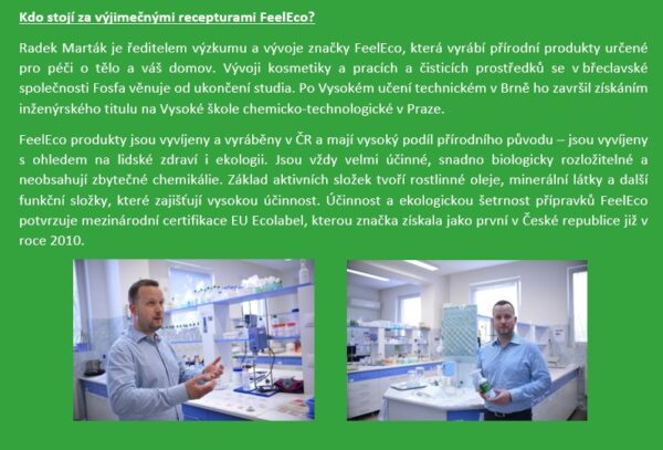 „Zvířata tráví většinu dne na zemi, kde jsou s čističi v kontaktu nejvíce. Právě proto jsme při vývoji kladli důraz na výběr složek, jejich kombinaci i koncentraci a obsah i výběr parfemací. Naše čističe jsou nejen účinné, ale zároveň ohleduplné ke všem členům domácnosti – i těm čtyřnohým,“ vysvětluje Radek Marták, ředitel výzkumu a vývoje FeelEco.