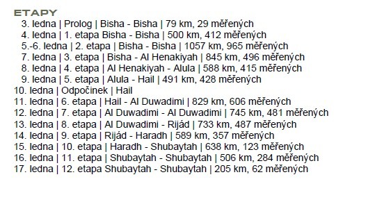 Druhý týden pak bude ve znamení přejezdu dun Rub al Chalí, největšího nepřerušeného písečného úseku na světě, až do cíle v pátek 17. ledna v Šubajtě. Rozmanitá trasa vyžadující jedinečný přístup, jak upozorňuje Sébastien Loeb před svým devátým startem na této soutěži.