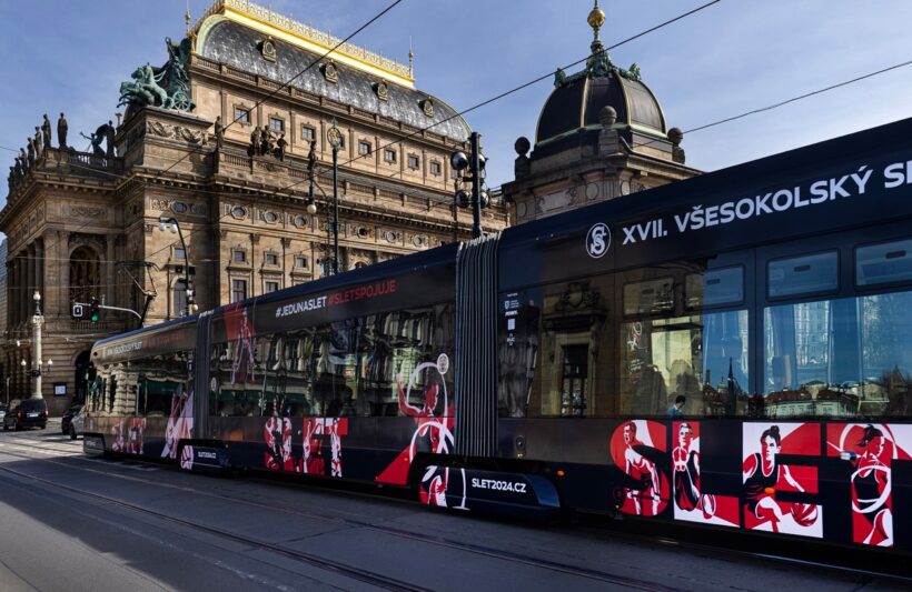 Sokolové představili i sletovou tramvaj, které od tohoto týdne díky partnerství s pražským dopravním podnikem jezdí ulicemi hlavního města. Tramvaj bude nejčastěji nasazována jako linka č. 22 křižující klíčová místa letošního sletu: Tyršův dům, Národní divadlo i Fortuna Arenu v Edenu. Na designu soupravy se podílelo studio Dynamo design, které umně využilo ilustrace známého výtvarníka Jaromíra 99.