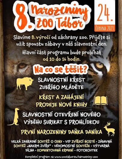 Křest mláděte zubra, jehož jméno vybere veřejnost, představení a zahájení prodeje nové knihy, slavnostní otevření nového výběhu...
